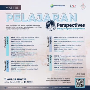 Perpectives Study Program diselenggarakan secara lokal di berbagai tempat oleh para volunteers, yang biasanya alumni, yang telah mengalami perubahan setelah mengikuti program ini dan ingin menggerakkan komunitas mereka untuk juga terlibat dalam tujuan global Tuhan. Di Indonesia, program ini salah satunya diselenggarakan oleh Perspectives Indonesia dan bekerja sama dengan Sekolah Tinggi Teologi Bandung. Pelajari mengenai program Perspective lebih lanjut: https://youtu.be/uCmZeb_j2LU |
