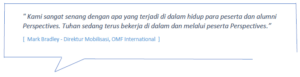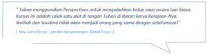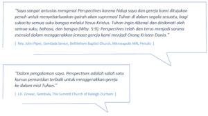 Perspectives adalah salah satu kursus misi terbaik yang akan menolong Saudara untuk memahami dan terlibat dalam misi Tuhan bagi dunia dari perspektif Alkitab, Sejarah, Budaya, dan Strategi.Hasil survey kepada 20.000 alumni Perspectives: