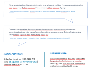 PENDAFTARAN :https://tinyurl.com/DaftarPSP2022 INFORMASI & BANTUAN:Apabila Anda ada pertanyaan tertentu terkait kelas ini, dapat menghubungi kami via WA Admin: https://tinyurl.com/HelpDeskPSP Apabila Anda ada pertanyaan tertentu terkait kelas ini, dapat menghubungi kami via WA Admin: https://tinyurl.com/HelpDeskPSP • Sampai jumpa dalam kelas Perspectives, |